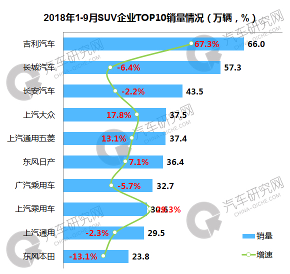 2018年9月SUV企业:长城销量排名第一 同比下滑18.8%