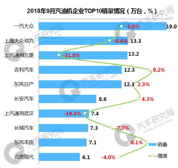 2018年9月汽油机企业:一汽大众排名第一 同比下滑3.0%