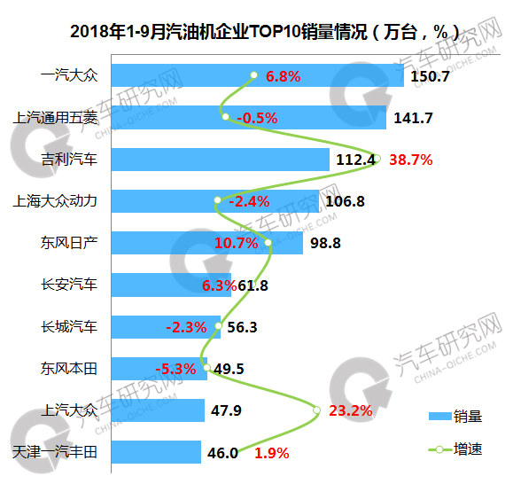 1-9月汽油机企业中,一汽大众位居第一,销量达到150.7万台,同比增长6.8%;上汽通用五菱位居第二,累计销量达到141.7万台,同比下滑0.5%;前十企业中,吉利汽车增幅最高,同比增长38.7%。