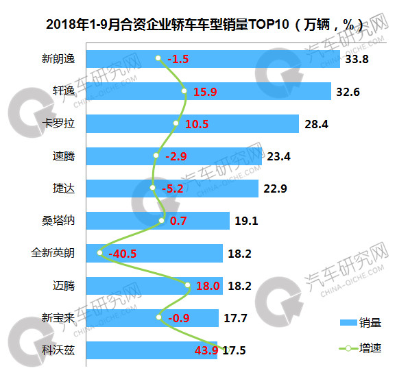 1-9月,合资轿车销量前十车型中,上汽大众新朗逸凭借新款车型累计销量排名榜首,共计销售33.8万辆,同比微降1.5%。主要车型中,雪佛兰科沃兹表现优异,同比增幅超过40%;别克全新英朗则下滑较大,降幅达到-40.5%。