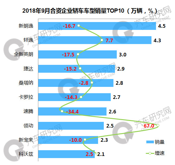 2018年9月合资企业轿车:大众新朗逸销量下滑 现代领