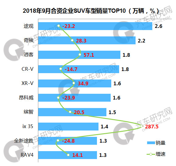 2018年9月合资企业SUV:途观排名第一 现代IX35增幅近3