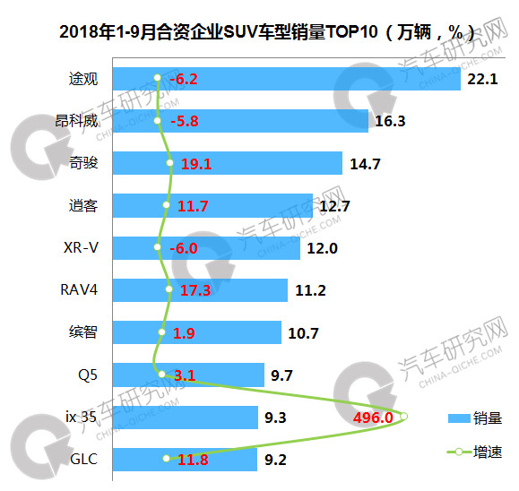 1-9月,合资SUV销量前十车型中,上汽大众途观车型累计销量排名榜首,累计销售22.1万辆,但同比下滑6.2%;别克昂科威和日产奇骏处于第二集团,其中奇骏增速较快。主要车型中,北京现代通过战略调整走出去年的颓势,旗下ix35车型同比劲增496%,销量明显回暖。