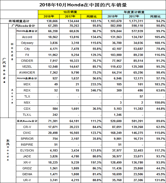 2018年10月广汽本田汽车有限公司和东风本田汽车有限公司的终端销量总计138,666辆,同期比为103.1%。其中,广汽本田汽车有限公司10月份终端销量为67,285辆,同期比为95.8%;东风本田汽车有限公司10月份终端销量为71,381辆,同期比为111.2%。