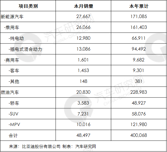 比亚迪10月销量4.1万辆 燃油车同比增长超37%