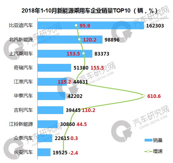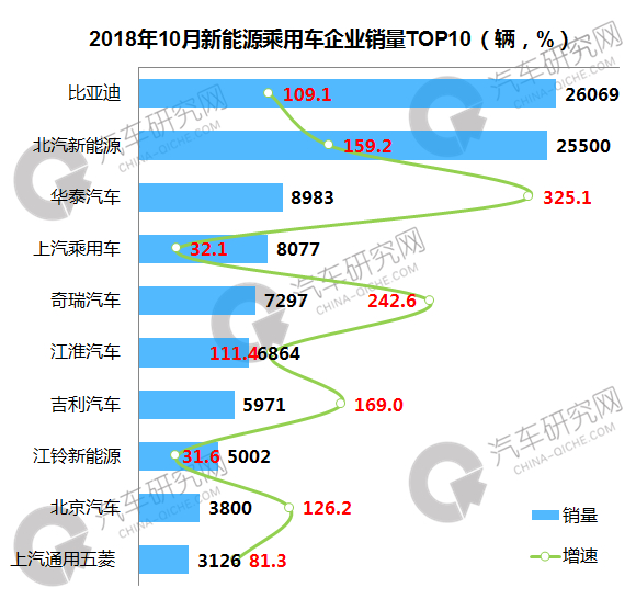 2018年10月新能源乘用车:比亚迪与北汽销量均超2.5万