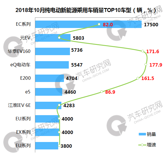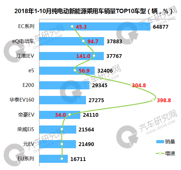 10月纯电动乘用车型销量中,北汽新能源旗下EC系列重回榜首,前十车型中华泰EV160、奇瑞eQ电动车和江铃E200表现良好,增幅均超过150%。