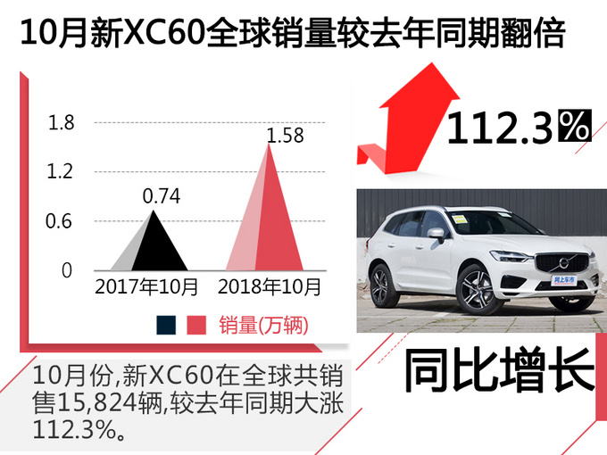 沃尔沃汽车集团公布最新销量数据显示,2018年1-10月沃尔沃在华销量破十万,累计销量107,275辆,同比增长15.2%。1-10月沃尔沃全球销量526,062辆,较去年同比增长14%。2018年10月,新XC60全球共销售15,824辆,较去年同期大涨112.3%。