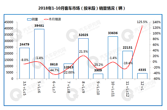 1-10月,客车市场主要集中在5-6米、10-11米和8-9米三个米段区间,分别销售39481辆、33636辆和32025辆,同比分别增长9.3%、22.0%和6.9%;12米以上客车销量增势喜人,增幅超过120%;其他米段销量均呈现不同程度下滑。