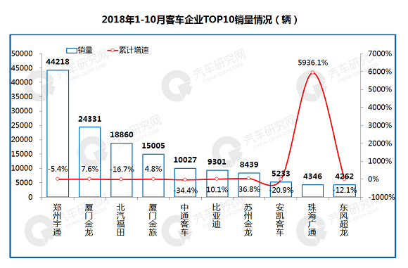 1-10月客车前十企业中,郑州宇通位居第一,累计销售44218辆,同比下降5.4%;厦门金龙和北汽福田位居第二集团,累计销量均超过18000辆,同比分别增长7.6%和-16.7%;前十企业中,珠海广通增长迅猛,增幅超过5000%;中通客车累计销量下滑较大,降幅超过30%。