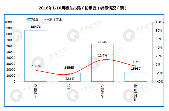 1-10月,客车销量主要集中在座位客车和公交客车两大类,分别实现销售86476辆和63649辆,分别同比增长-13.8%和11.4%;校车市场销量则出现明显下滑趋势。