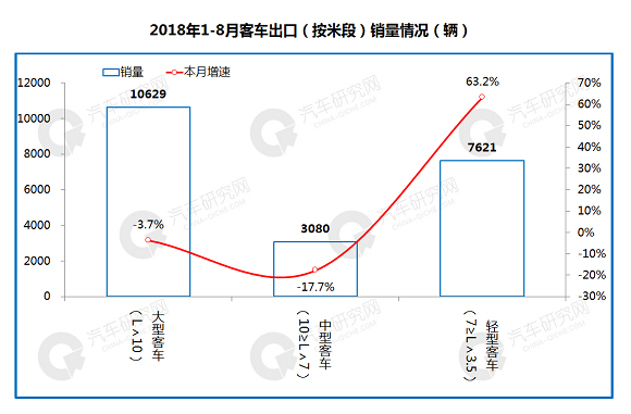1-8月,客车市场出口车型中,主要集中在大型客车市场,共计出口10629辆,但累计增速下滑3.7%;轻型客车共计出口7621辆,实现同比增长63.2%,市场表现良好;中型客车市场出口量下滑较大,降幅接近-20%。