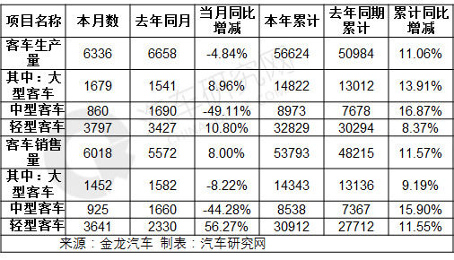 12月6日,厦门金龙汽车发布11月份产销快报。数据显示,截至11月30日,累计生产客车为56624辆,同比上升11.06%;累计销售53793辆,同比上升11.57%。