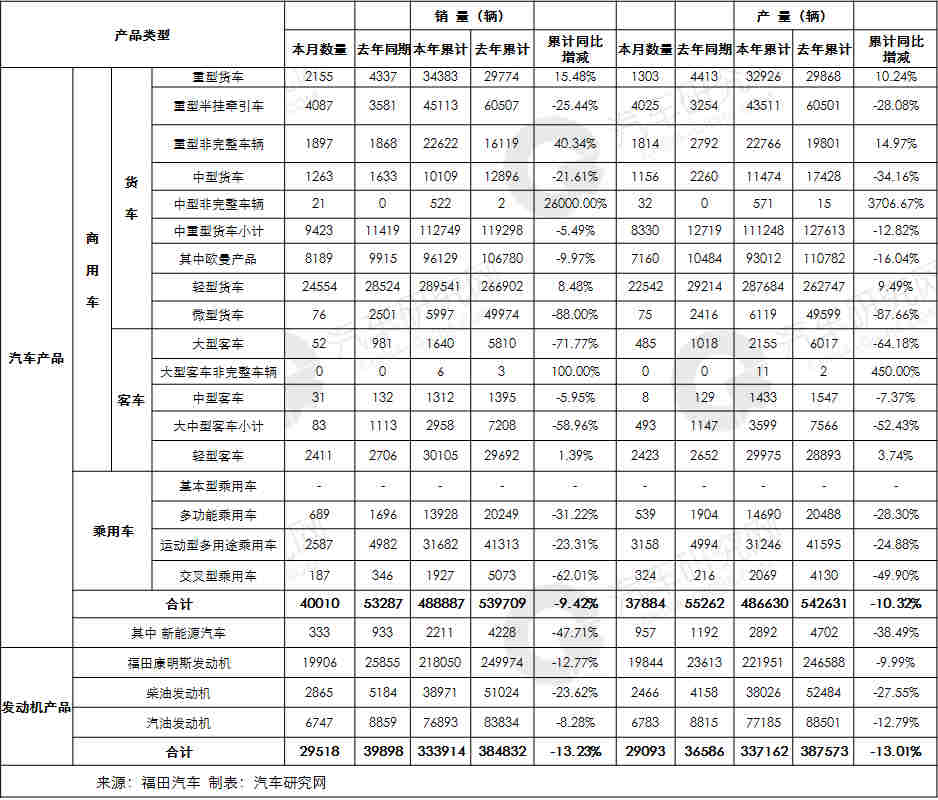 附件:福田汽车2018年11月份各产品产销数据快报