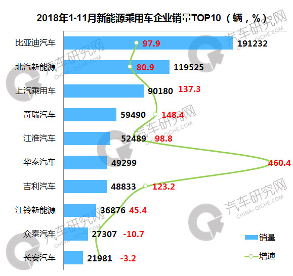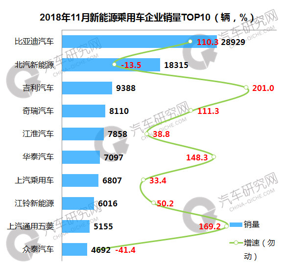 2018年11月新能源乘用车:比亚迪高居榜位,增速超100%