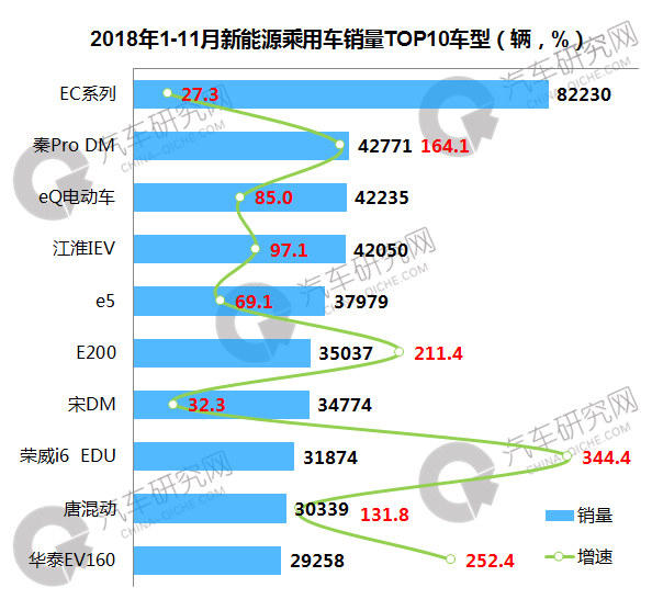 1-11月新能源乘用车车型中,北汽EC系列以8.2万辆的成绩遥遥领先,比排名第二的比亚迪秦多3.9万辆;奇瑞eQ电动车和江淮IEV位居第二集团,前十车型中,荣威i6、江铃E200和华泰EV160增幅相对较大,均超过200%。