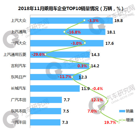 11月乘用车企业中,上汽大众位居第一,销量达到19.8万辆,同比下滑3.3%,上汽通用位居第二,销量达18.1万辆,同比下滑16.8%;前十企业中,一汽丰田增幅最大,同比增长19.7%,销量为7.3万辆;上汽通用五菱降幅最大,同比下滑29.6%。