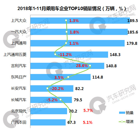1-11月,乘用车企业中,上汽大众位居第一,销量达到189.5万辆,同比增长1.3%,一汽大众紧随其后,销量达到185.6万辆,同比增长1.8%;前十企业中,吉利汽车增幅最大,销量增幅达到28.6%。