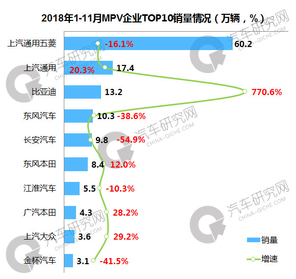1-11月,MPV企业中,上汽通用五菱位居第一,销量达到60.2万辆,同比下降16.1%,上汽通用前11月累计销售17.4万辆,同比增长20.3%;前十企业中比亚迪增幅最大,增速同比超过700%,销量达到13.2万辆。