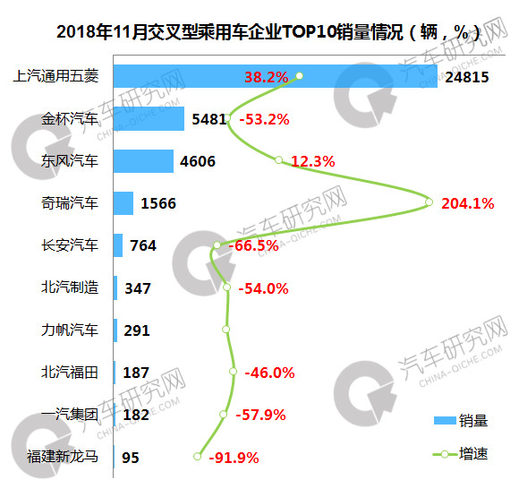 11月交叉型乘用车企业中,上汽通用五菱位居第一,共计销售24815辆,同比增长38.2%;奇瑞汽车位居第四,增幅最大,超200%;东风汽车位居第三,增速为12.3%;其他企业均出现超40%以上的下滑。