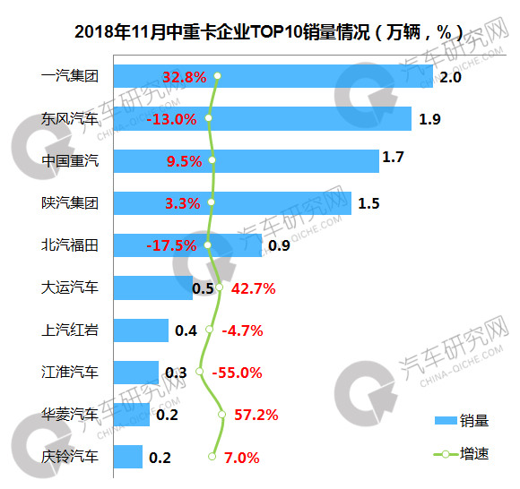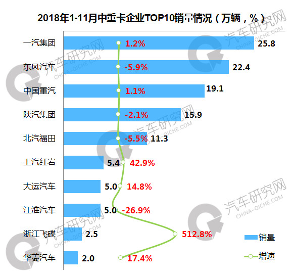 2018年11月中重卡企业:浙江飞碟累计销量增幅超过500%