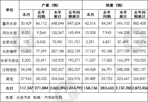 长安汽车发布11月份产销快报 累计产销量双双下滑