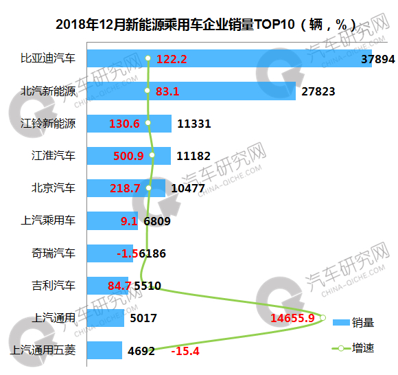 12月新能源乘用车企业中,比亚迪高居榜首,销量超过3.8万辆,北汽新能源紧随其后,销量达2.8万辆,江铃、江淮和北京汽车位居第二集团,销量均在1万辆以上;前十企业中,除上汽通用五菱外,销量均超过5000辆,其中,上汽通用增速明显,增幅接近15000%。
