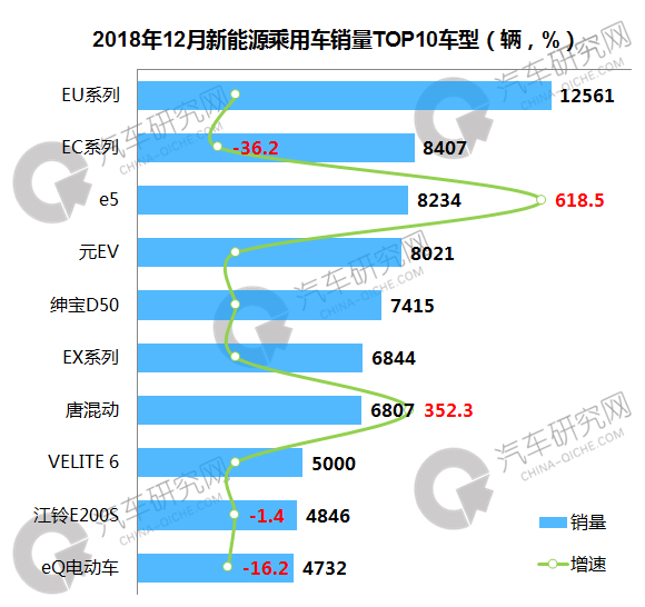 12月新能源乘用车车型中,北汽EU系列单月销量达到12561辆,排名第一,EC系列滑落至第二位,销量超过8000辆,同比下滑30%以上。从销量前十榜单中,北汽新能源和比亚迪各占3席;比亚迪e5和唐混动本月表现突出,增幅均在300%。