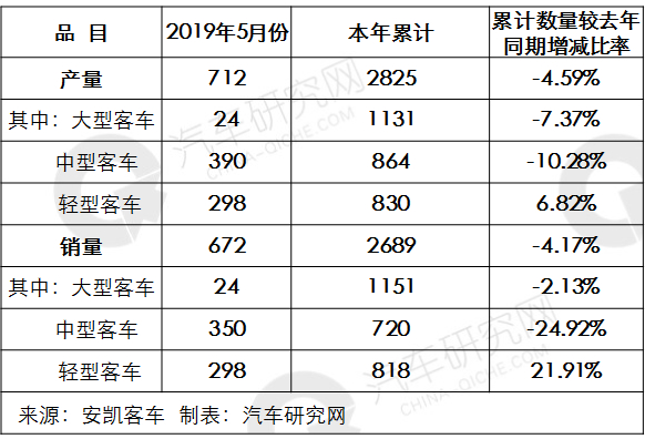 安凯客车5月产销快报 仅轻型客车累计同比增速处于正增