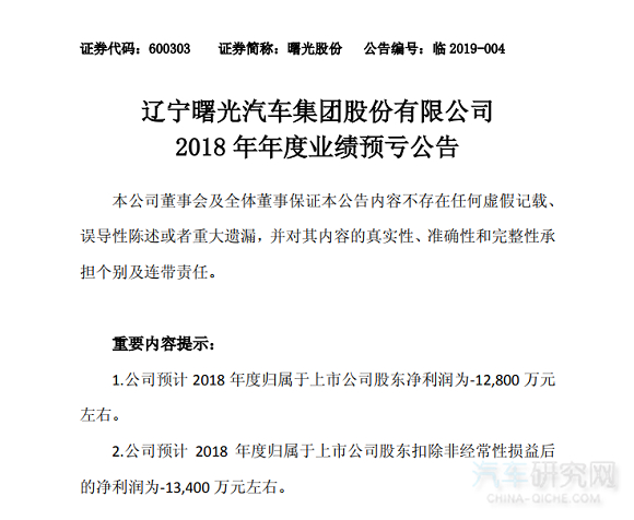 1月30日辽宁曙光汽车集团股份有限公司发布2018 年年度业绩预亏公告 ,公告称, 经财务部门初步测算,预计 2018 年年度实现归属于上市公司股东的净利润与上年同期(法定披露数据)相比,将出现亏损,实现归属于上市公司股东的净利润-12,800 万元左右。 归属于上市公司股东扣除非经常性损益后的净利润-13,400 万元左右。