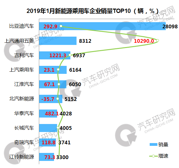 1月新能源乘用车企业中,比亚迪高居榜首,销量接近3万辆,同比增长292.9%;北汽新能源位居第二,销量仅达8312辆,远远落后于第一位;吉利、上汽乘用车和江淮汽车销量不相上下,销量均在6000辆以上;前十企业中,上汽通用五菱表现突出,增幅超10000%,其次,吉利汽车表现也很不错,增幅超1000%。