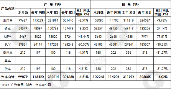 广汽集团2019年2月销量达102265辆 同比下滑11.0%