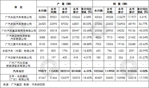 3月11日,广汽集团发布2019年2月产销快报。数据显示,2月汽车累计产量99879辆,同比下滑13.5%,累计销量102265辆,同比下降11.0%