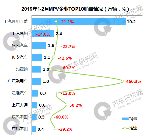 1-2月MPV企业中,上汽通用五菱位居第一,累计销量超10万辆,同降幅21.1%,上汽通用累计销售2.4万辆,同比下降14%;前十企业中广汽乘用车增幅最大,近500%。