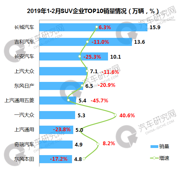 2月SUV市场:长城汽车蝉联榜首 一汽大众逆势大增80%