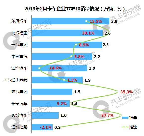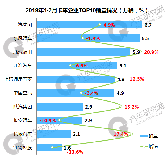 卡车市场:2019年1-2月总体微增 前十企业五升五降