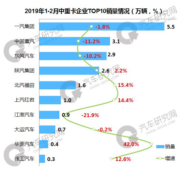 1-2月中重卡前十企业中,一汽集团继续保持领先,累计销量达到5.5万辆,同比微降1.8%,重汽位居第二,累计销量3.1万辆,同比下滑11.2%,东风位居第三,销量为2.9万辆,同比下降10.2%;前十企业中,华菱增幅最大,增幅超过40%。