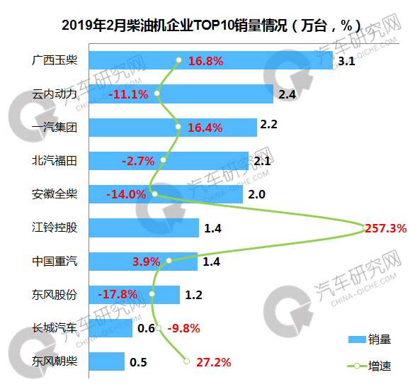 2月份柴油机企业中,广西玉柴位居第一,销量接超3万台,同比增幅16.8%;云内动力位居第二,销量2.4万台,同比下降11.1%;前十企业中,江铃控股增幅最高,增幅为257.3%。