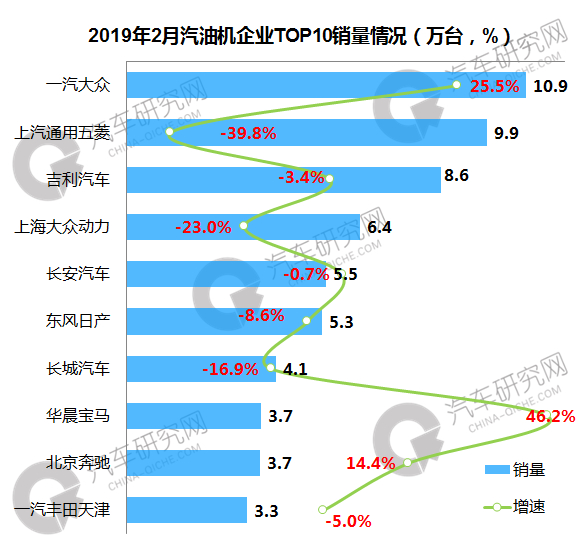 2月汽油机市场:一汽大众单月销10万 华晨宝马大增50