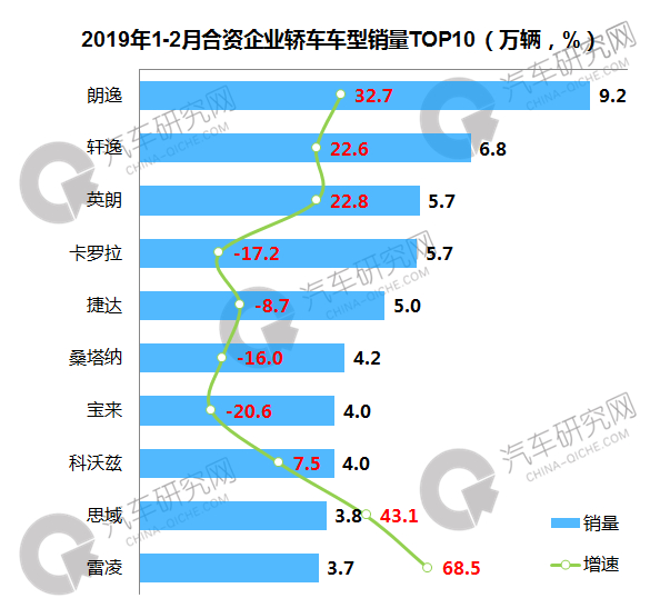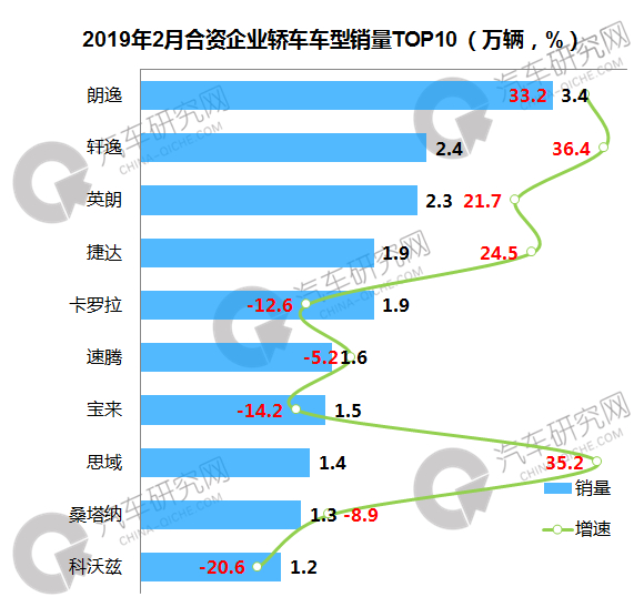 2月合资轿车销量中,上汽大众朗逸蝉联榜首,单月销售3.4万辆,同比增长33.2%;东风日产轩逸和上汽通用英朗为第二集团,同比分别增长36.4%和21.7%。前十车型中,东风日产轩逸和东风本田思域增长较快。
