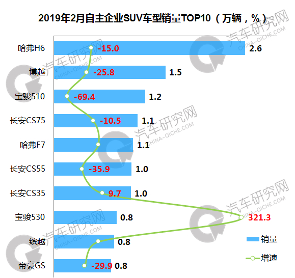 2月自主SUV销量主要车型中,哈弗H6连续两月占据榜首,销量远超排名第二的吉利博越,月销售达到2.6万辆,但受大环境影响,同比滑落15.0%。宝骏530跻身本月榜单第八名,实现销量达0.8万辆,与缤越和帝豪GS并驾齐驱。