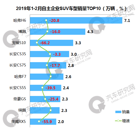 2019年1-2月自主SUV销量前十车型中,哈弗H6牢牢占据市场头把交椅,累计销售7.1万辆,领先第二位近3万辆;吉利博越位居第二位,累计销量达到4.3万辆,同比下滑16.0%;受同门兄弟宝骏530上市影响,宝骏510的销量出现较大幅度的下滑,另外荣威RX5下滑也较为明显,降幅均超过50%。
