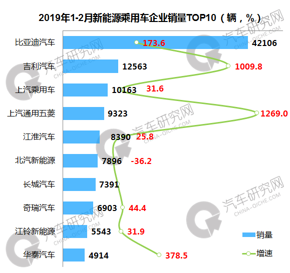 2019年1-2月,前十企业中,比亚迪已远远拉开与第二位差距,累计销售4.2万辆,同比增长173.6%,前十企业中,多数企业实现正增长,吉利前两个月的销量比同期累计增长了10倍,上通五菱累计销量虽然排名第四,但当月榜单已不见其踪影。