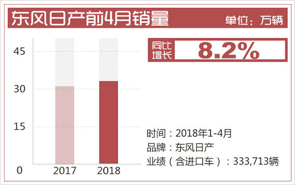 东风日产今年4月终端销量超9万辆,在具体产品表现上,奇骏4月销量为15,576辆,同比增长32.9%;楼兰4月共售出2,584辆,同比增长40.1%;轩逸4月销量为36,471辆,同比增长33.9%。截至4月底,东风日产2018年累计销量已达333,713辆,同比增长8.2%,其中SUV产品表现抢眼,前4个月销量为136,563辆,同比大幅增长26.8%。
