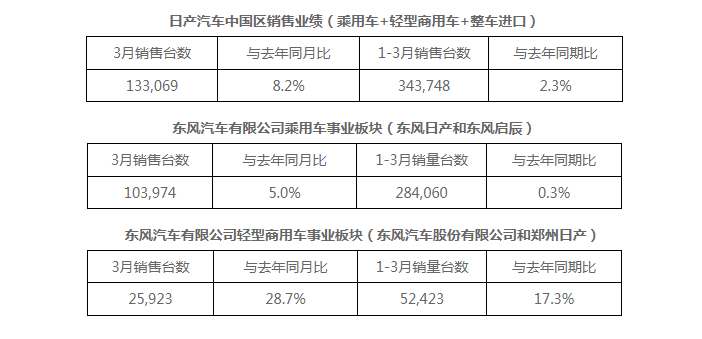 日产汽车和东风汽车有限旗下乘用车事业板块(包括东风日产和东风启辰)的销量分别为133,069台和103,974台,同比分别增长8.2%和5.0%;轻型商用车事业板块(包括东风汽车股份有限公司和郑州日产)销量为25,923台,同比增长28.7%。