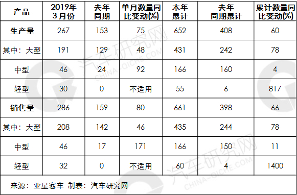 亚星客车公布,3月份产量同比增长75%,销量同比增长80