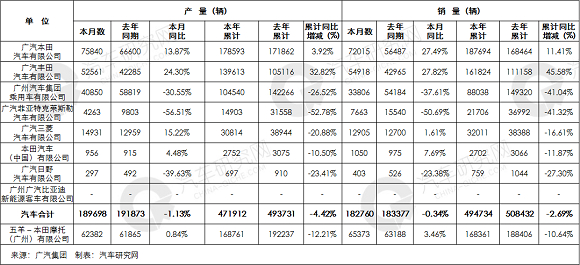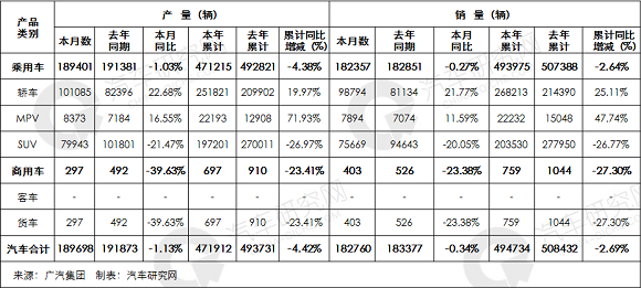 4月10日,广汽集团发布2019年3月产销快报。数据显示,3月汽车累计产量189698辆,同比下滑1.13%,累计销量182760辆,同比下降0.34%;1-3月广汽集团累计产量471912辆,同比下滑4.42%,累计销量494734辆,同比下滑2.69%。