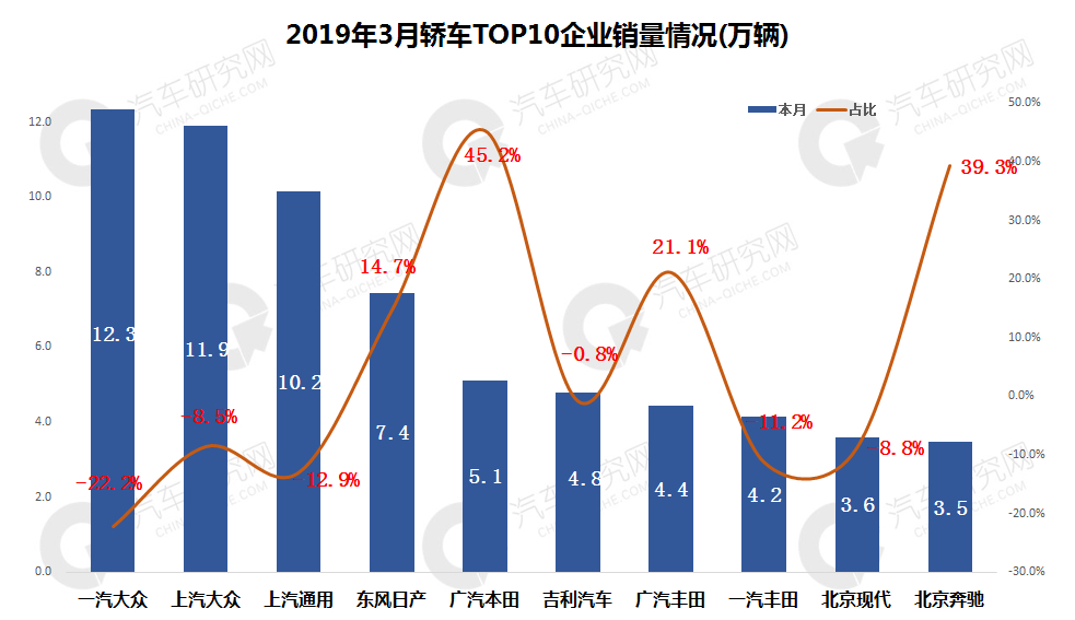 南北大众稳居前三,同比双双下滑,上汽通用以10.2万辆成绩位居第三位,前三企业销量均超   10万辆,广汽丰田3月销售4.4万辆,同比增长21.1%,重回前十,位列第七。广汽本田增幅最高,达到45.2%。