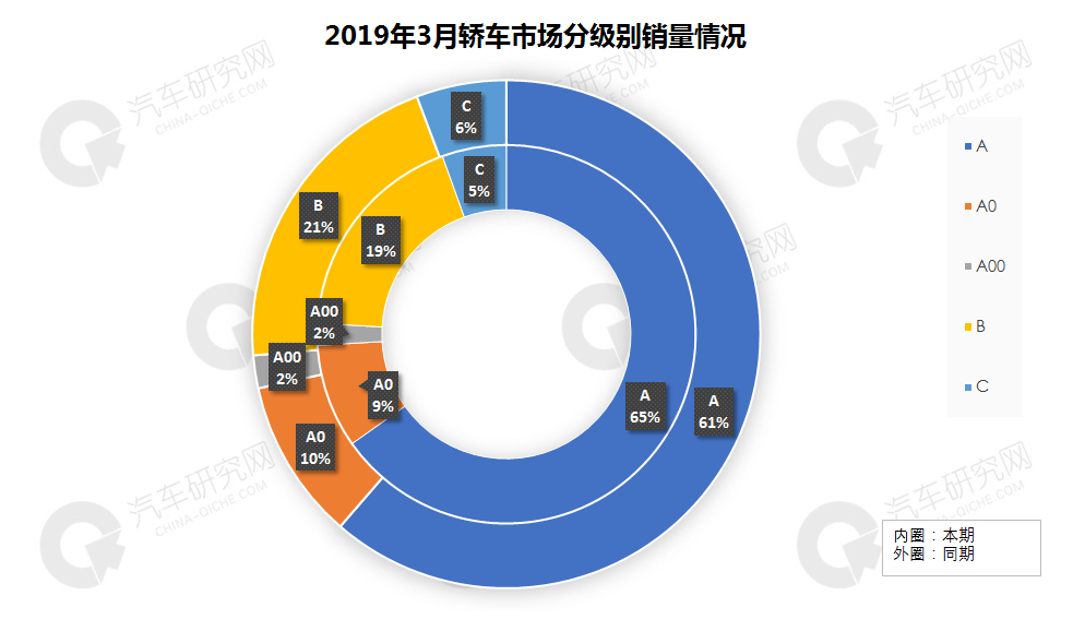 分级别来看,A级轿车销量同比增长4个百分点,继续巩固作为轿车主体车型的市场地位,挤占B级轿车份额下降2个百分点,A0和C级轿车份额各下降1个百分点。