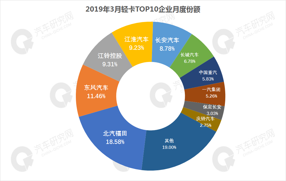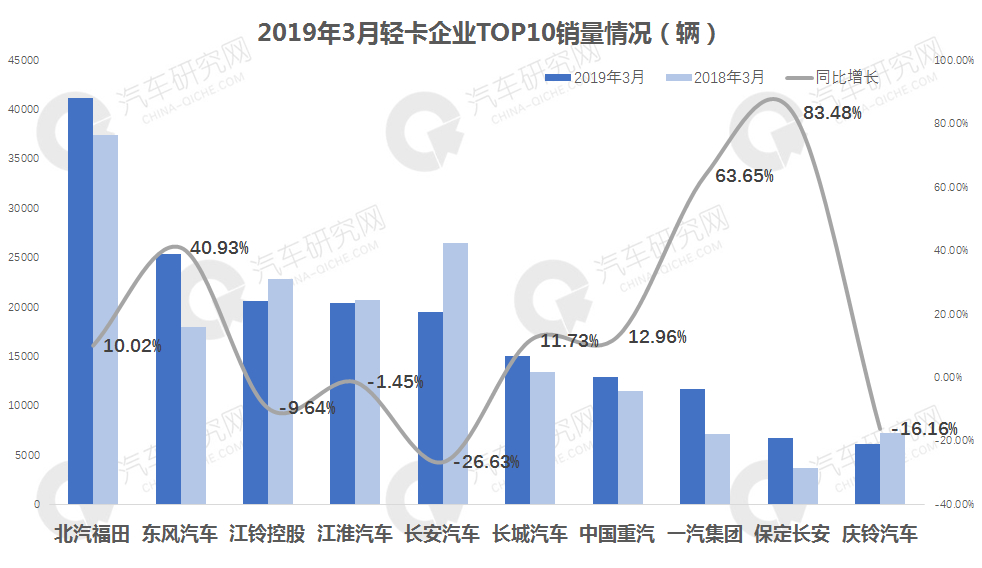 3月轻卡前十企业排名:6增4降,北汽福田4.4万辆领跑轻卡企业,东风本月大幅增长,位居亚军,本月增长的企业福田、东风、长城、重汽、一汽、保定长安,其中保定长安实现大幅增长,增幅超80%,下降的企业分别是江铃、江淮、长安、庆铃,其中长安汽车降幅最高,达26.63%,由于本月销量下滑严重,排名下降2位。排名2-4位企业本月销量均超2万辆,本月仅保定长安和庆铃汽车销量未达万辆。